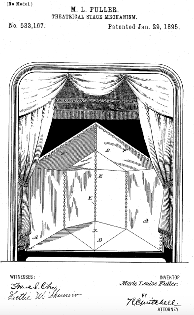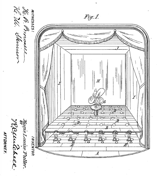In 1895, Fuller patented “Theatrical Stage Mechanism” ( US 533167 ). The design consisted of mirrors on stage in a darkened auditorium to give the illusion of multiple dancers performing. In the patent application Fuller wrote, when the mirror flooring (B) and the inclined mirror ceiling (D) are utilized in connection with the vertical reflecting surfaces (AA), and all in combination with the rows of light, the reflections of the dancer will be increased many fold [pg. 1 lines 78–84]. Specification was clearly disclosing the technology behind her Mirror Dance.