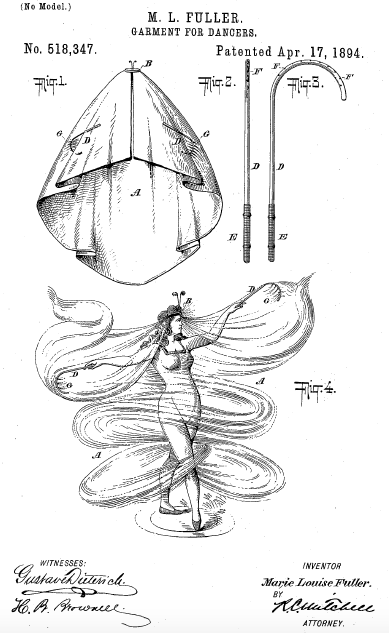 Also in April of the same year, Fuller patented “Garment for Dancers” (US 518347) which was specifically designed for Serpentine Dance. She also was granted a patent for the same invention in France (1BB227107 -1893) and England. The patent specified a dancing garment consisting of a skirt, the upper edge of which is attached to a crown-piece. Said skirt with two wand one end of each of which is attached to the skirt near its lower inner edge, adjesent to the sides of the dancer, the opposite ends of the wands being loose and adapted to be grasped by the hands of the wearer for the purpose of manipulating the garment (Claim 1).