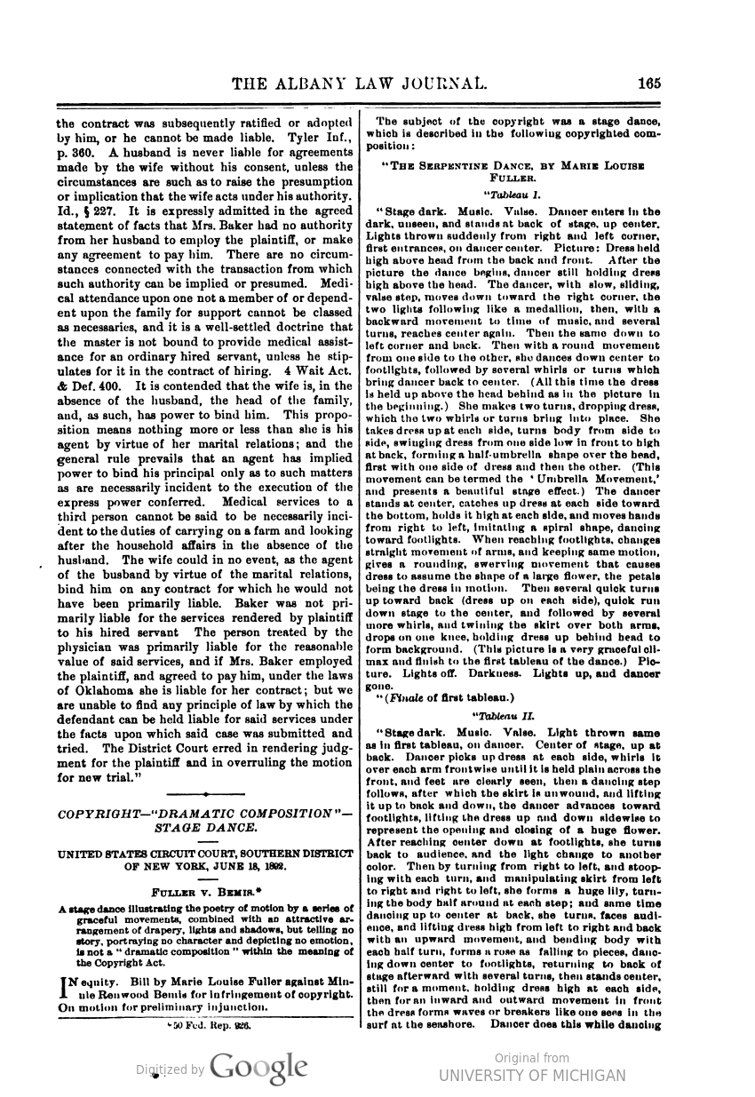 In Fuller v. Bemis, Fuller claimed Serpentine Dance was a dramatic composition and therefore the copyright registration of it was valid. Nevertheless, the judge for the U.S. Circuit Court denied Fuller’s request for an injunction on the grounds that Serpentine Dance can not be considered as a “dramatic” or “dramaticomusical composition”, therefore not eligible for copyright protection.
