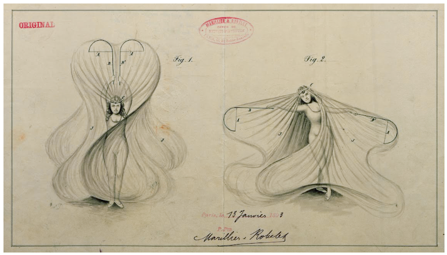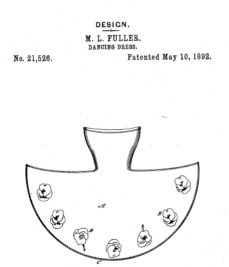In January 1893, -despite her failure to safeguard her choreography, Fuller publicly declared that she will take legal action against anyone who imitates her work. Six months after the U.S. Circuit Court denied her claim on copyright infringment, Fuller switched strategy and pursued industrial property rights in her technical and design work.